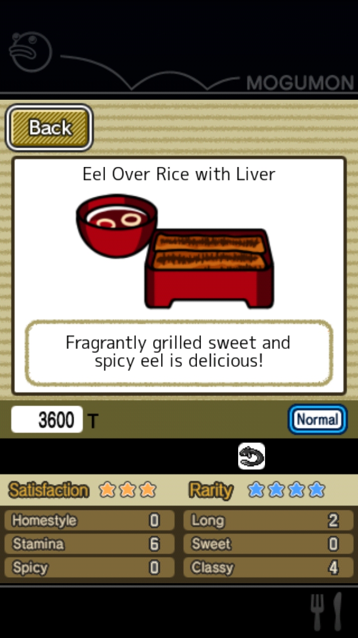 食材種類根據前往區域的不同而有差異,例如有些地方會出現比較多的辣(Spicy)屬性食材,玩家在賣掉以後可以買到有辣屬性的料理。在本作中非常重要的一點,就是必須從菜單圖鑑中看到各料理的性質及屬性,以決定 Mogumon 的進化方向