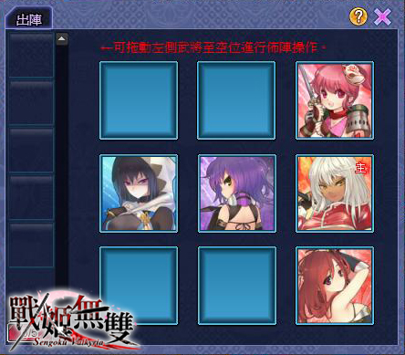 任何一位武將都有其單獨的移動距離和攻擊距離,出征前可進行排兵佈陣資源優化配置,以達到戰鬥時的最佳效果。玩家等級愈高,佈陣的單位就愈多,可容納更多的武將。主將不可下陣,主將等級若是不夠將不能開啟封印陣位,也無法招募更多武將。