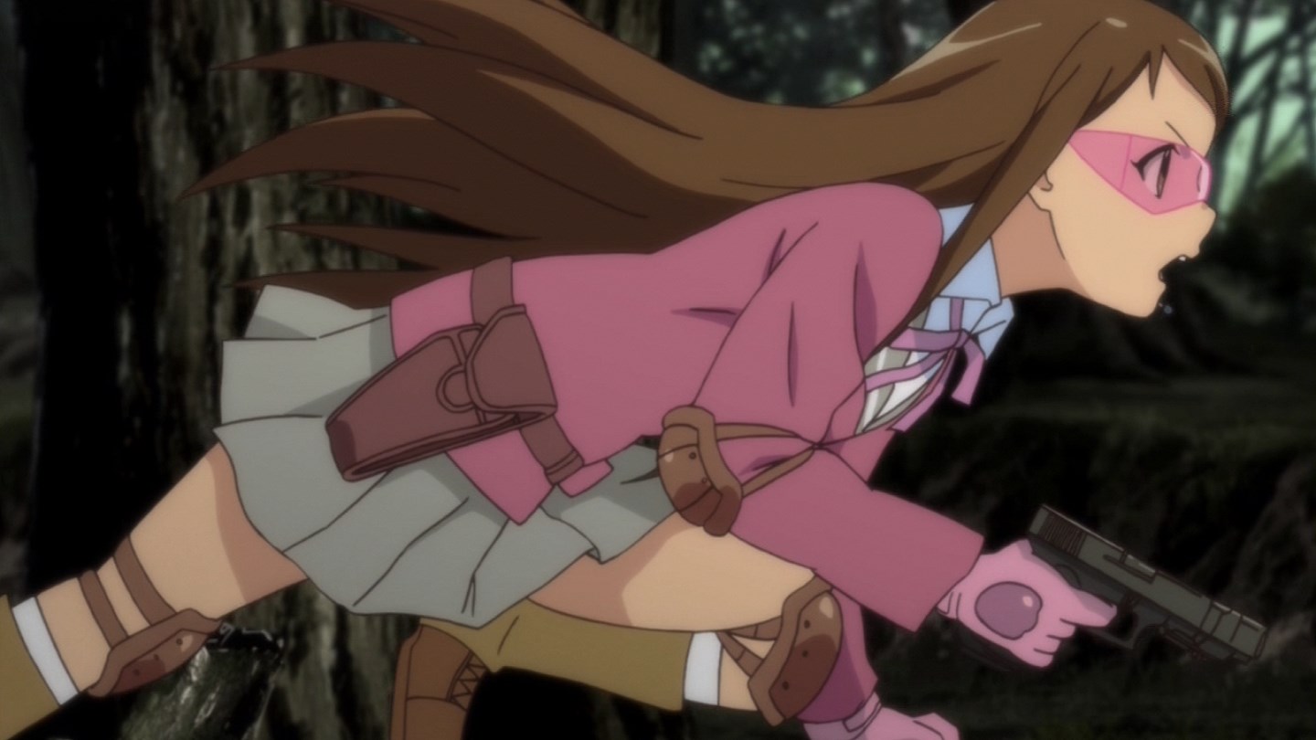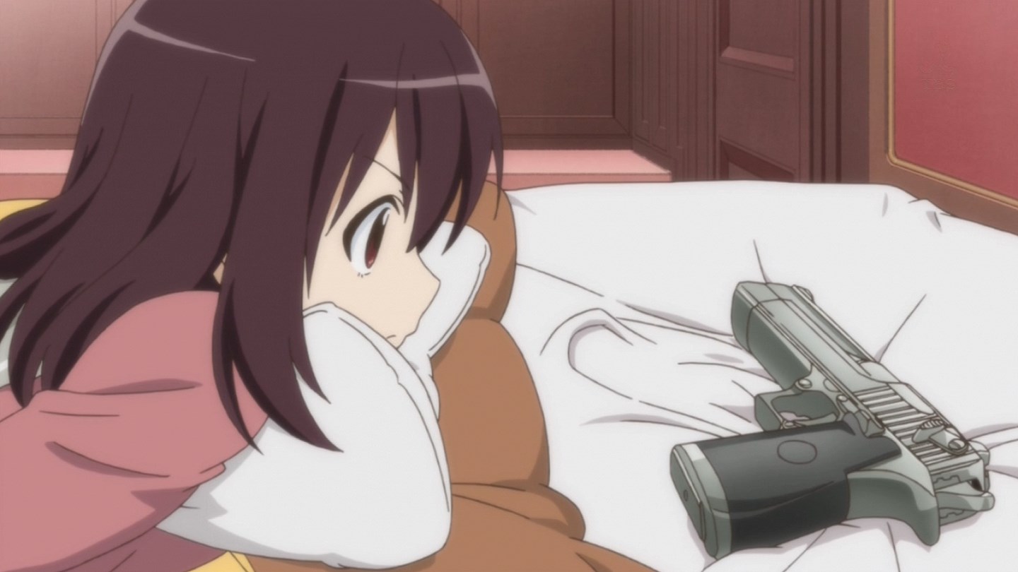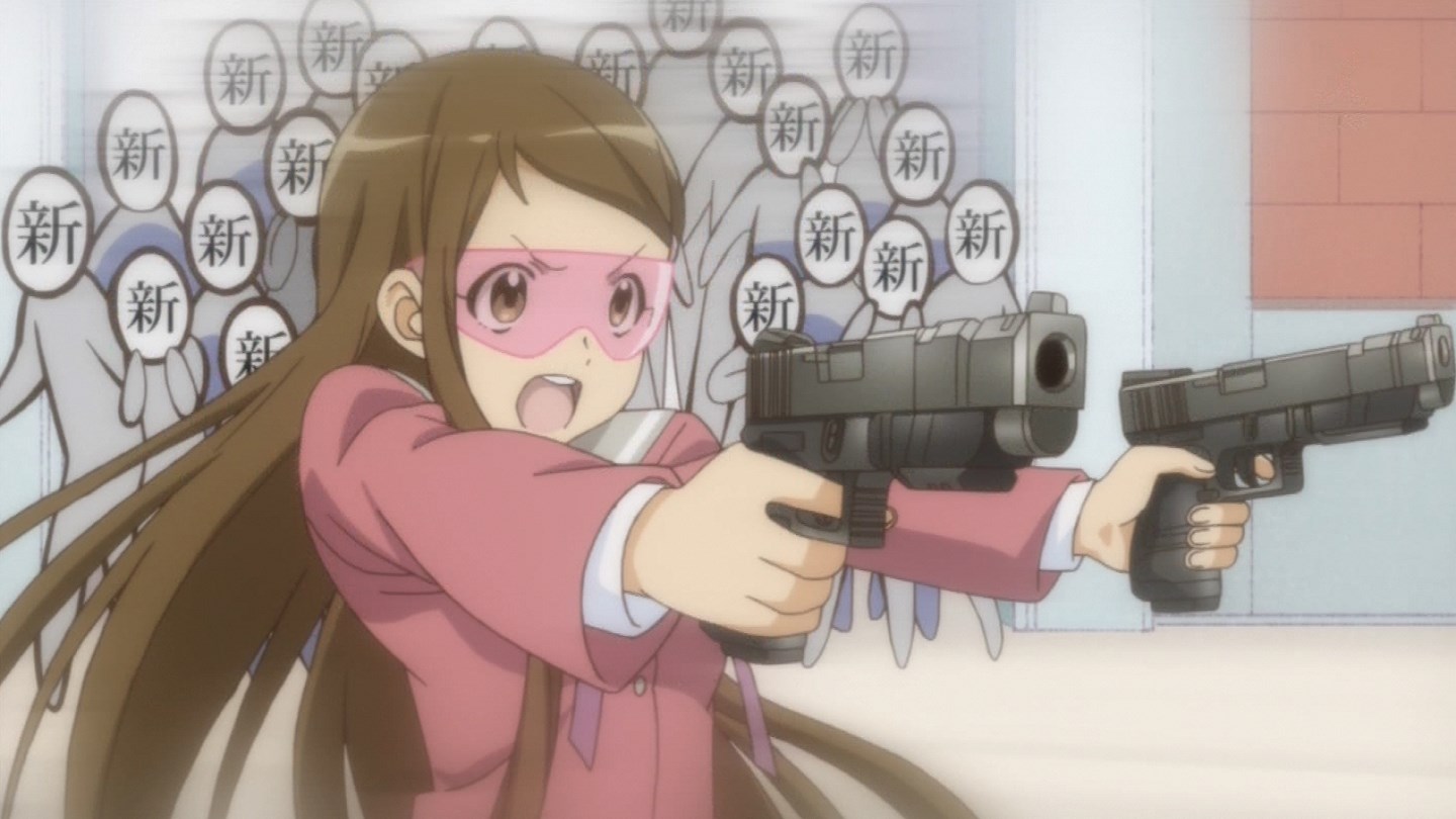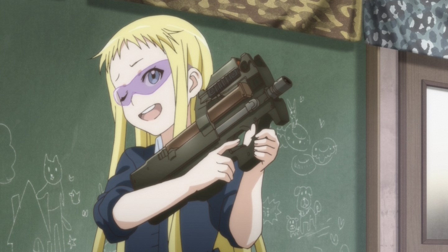 「第一話、有沒有志願兵啊!?」即將就讀於憧憬已久的史黛拉女子學院高中部,心中懷著種種期待來到女生宿舍的大和由良,三年級的室友鹿島園羅因為放假回家尚未歸來,由良在房間裡開始幻想著未來宿舍生活…結果卻在枕頭下發現了一把「沙漠之鷹」,與大小姐學校印象完全不合的銀色手槍將她那玫瑰色的妄想給完全擊碎了。