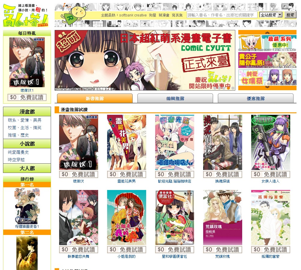而目前日本方面也挑選了 200 多本作品,出版公司包括 SoftBank、COMIC CYUTT、G2Comix 等。此外台灣方面也積極與國內出版社進行授權合作,收錄內容包括禾馬文化、狗屋出版社、未來數位、采舍國際、巨周數位等。在價格方面官方則指出,只要作品原價的一折就可以租到出版社的熱門暢銷書。