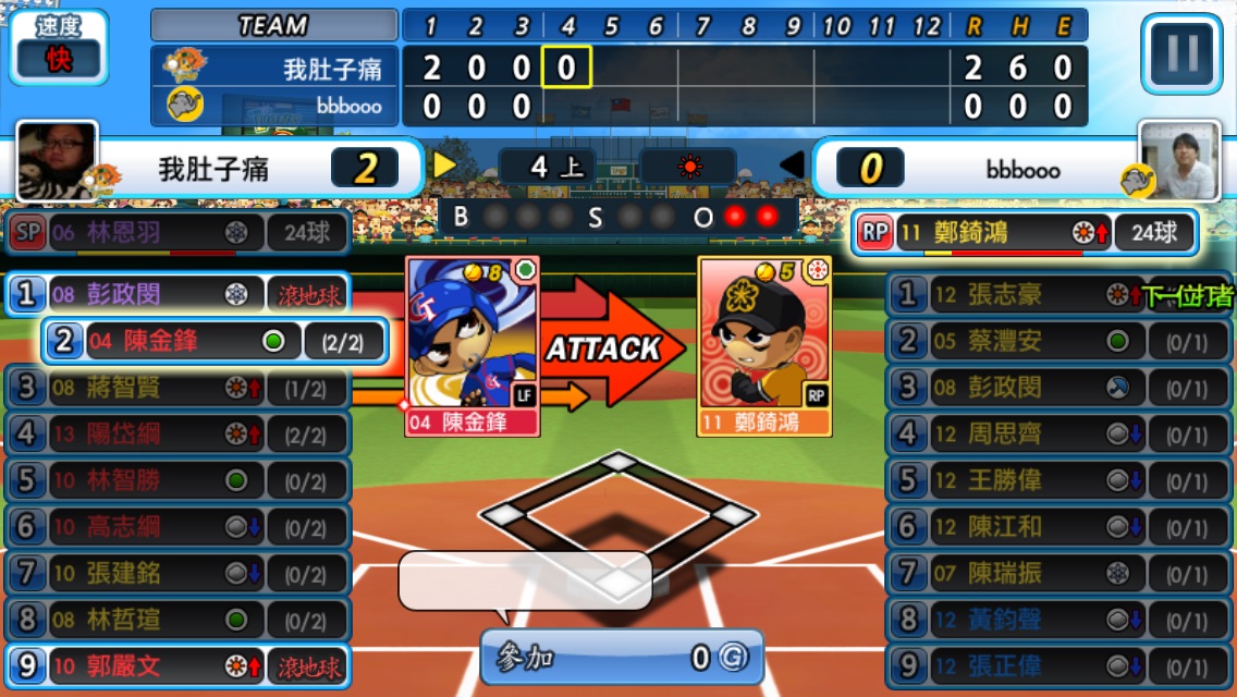 全民打棒球 2013》的精華,參加 1:1 對戰可以和其他玩家進行模擬競技,以玩家的卡片陣容進行賽程,所有玩家在比賽過程中,可以視球賽狀況,隨時進入比賽中親自操控打擊或投球。