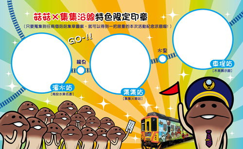 玩家除了可以搭乘菇菇列車之外,官方也舉辦了集章接力活動。只要在活動期間,於濁水站、集集站、車埕站的菇菇集章台集滿 2 個不同的菇菇章,就可以換菇菇涼扇 1 把;集滿 3 個不同的章,就可以換菇菇涼扇 1 把與微型積木火車站 1 個。