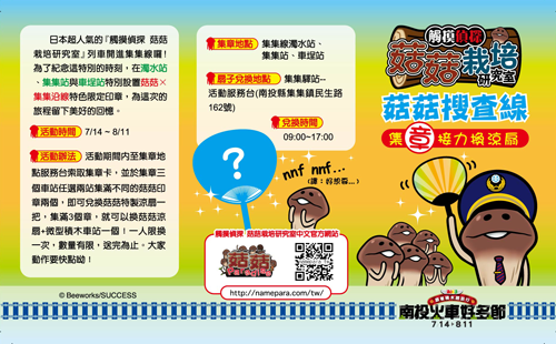 為了慶祝 2013 南投火車好多節,讓玩家在手機中栽種各種菇菇的 App《觸摸偵探 菇菇栽培研究室》即將在台推出彩繪列車。這次活動不但有特別版的列車長菇菇,還有各式各樣的菇菇印章等待玩家前來蒐集。