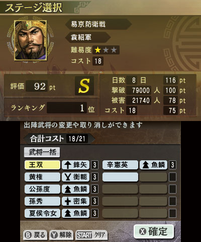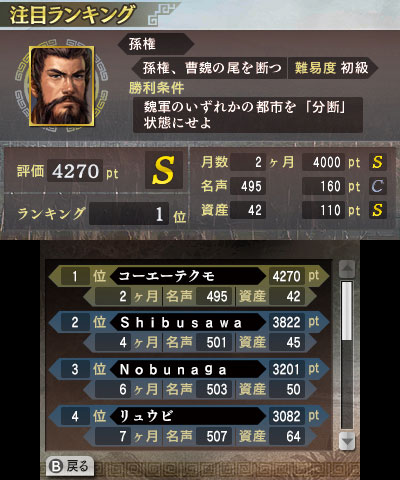 在 NDS 遊戲軟體《三國志 DS 3》中,可短時間由玩戰鬥而獲得好評的「英雄征戰之路」追加了新劇本跟排行榜功能 。