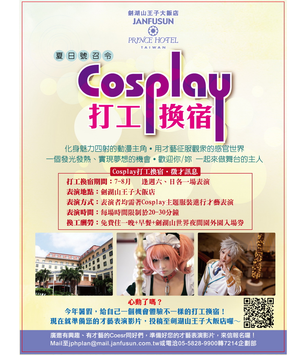 去年獲得熱烈迴響的Cosplay打工換宿計劃,今年同步發出夏日號召令囉!廣邀對動漫有熱誠、喜歡大SHOW才藝的朋友們,把握機會展現自己,體驗不一樣的打工換宿經驗,只要將您表演影片投稿至劍湖山王子大飯店,就有機會大展身手,渡過一個不同的暑假!