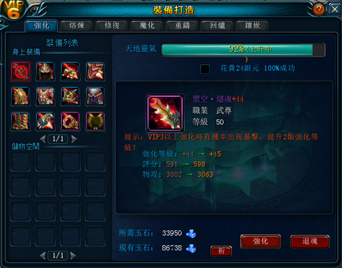 而裝備可進行強化提昇各項屬性。強化需要使用玉石,而強化有機率失敗,不過很低,就算失敗了,系統也會反還玉石,又是一項貼心的設計。