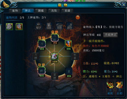 而陣法跟角色等級有關,等級越高,寵物陣法等級也越高,可以放的寵物位置也越多。至於遊戲內現在有多少寵物呢?就等玩家自己去發掘了!