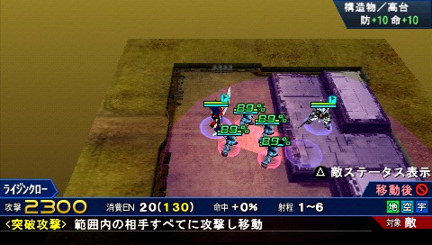 所謂「突破攻擊」是指可以攻擊小隊移動方向射程線上所有敵人的特殊攻擊。在指定小隊上選擇「突破攻擊」,並決定射程範圍內的移動方向,就會顯示移動範圍內對敵人的命中率,並攻擊所有的敵人。