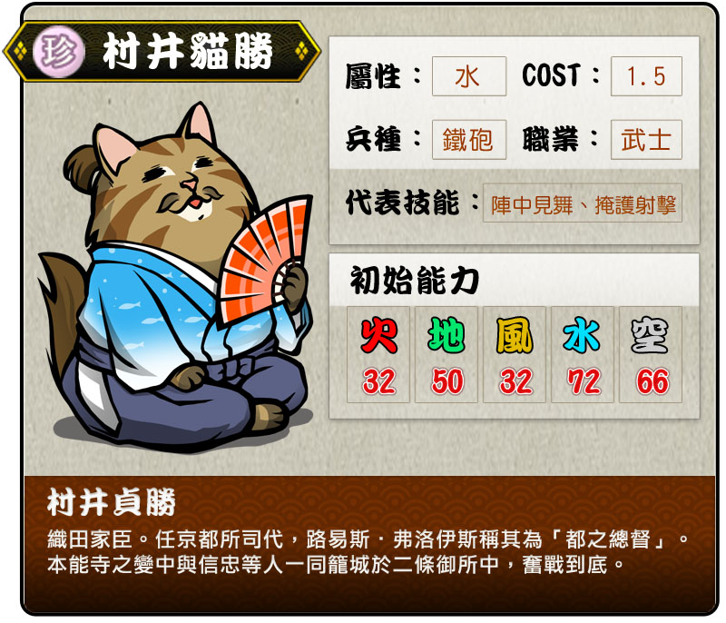 水屬性的「村井貓勝」是織田家臣中的第一位幕僚,擔任京都司代,幫助維持治安、修築內宮。後因本能寺之變,與織田信忠一起據守二條御所,遭明智光秀軍包圍、戰死!遊戲中擁有技能「陣中見舞」可恢復自身及周圍的我方兵力!