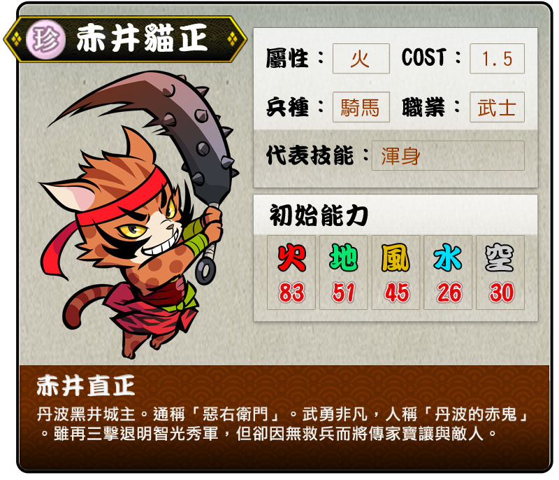 火屬性的「赤井貓正」是赤井時家的次子,又名「惡又衛門」,因兩次擊退明智光秀的丹波討伐軍,而獲得「丹波赤鬼」的勇名!遊戲中擁有「渾身」對敵方 1 人進行強力攻。