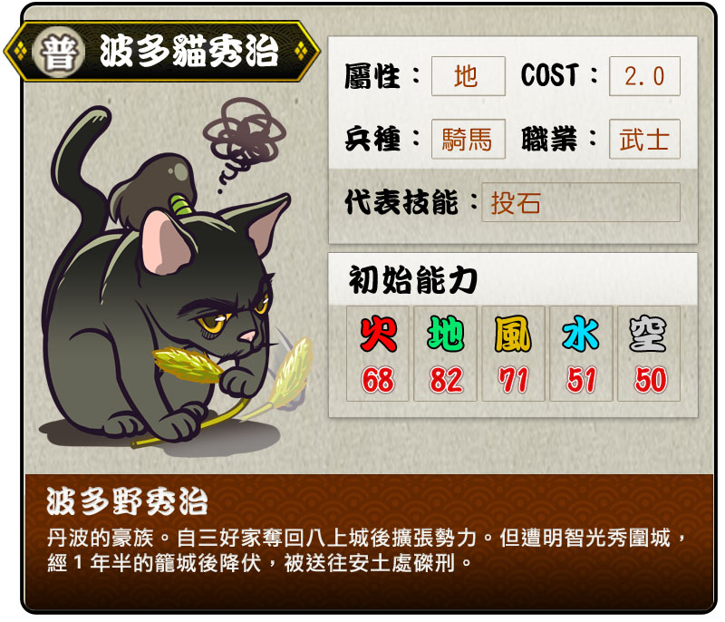 地屬性的「波多貓秀治」曾是三好長慶的家臣。因反叛織田家,而遭明智光秀鎮壓,秀治及其弟秀尚在安土城處死,波多野家就此滅亡。遊戲中代表技能「投石」可間接攻擊敵方1人,並有機率造成敵方混亂。