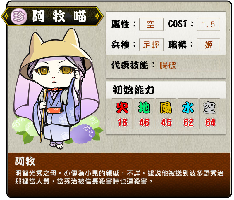 「阿牧喵」為明智光秀之母,據傳光秀為勸服波多野秀治降服,以阿牧作為人質。但因信長決意斬殺秀治及秀尚,在交換人質前,波多野家臣以織田家無信,將阿牧殺害。遊戲中擁有的代表技能「喝破」可解除 1 種周圍敵人的屬性強化。