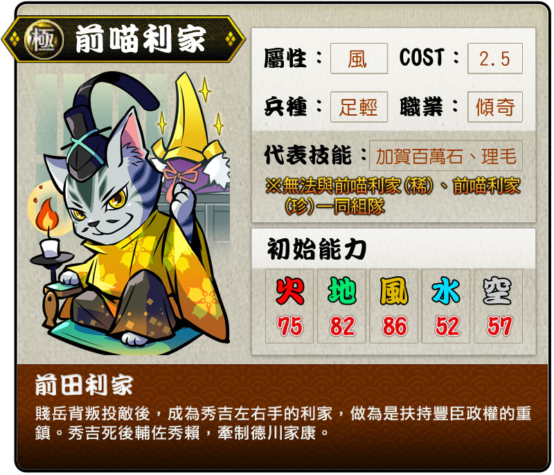 本次改版推出唯一貓武將極卡「前喵利家」,幼名犬千代,因善於揮舞長槍,又被稱作槍之又左。賤岳合戰後,改仕豐臣秀吉,輔佐豐臣秀賴,名列五大老之一!遊戲中其獨特技能「加賀百萬石」能減輕遠處敵貓對我方造成的傷害。