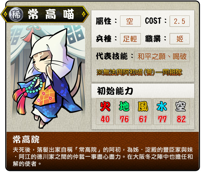 「空屬性」的「常高喵」本名為「淺井初」,丈夫京極高次過世後出家,號「常高院」,最後在江戶城與陪伴妹妹「江」在江戶城渡過餘生!正如「常高喵」為守護茶茶與江的愛,遊戲中其獨特技能「和平之願」可提高我方周圍恢復時的效果,且我方受到敵方術攻擊後將恢復兵力。