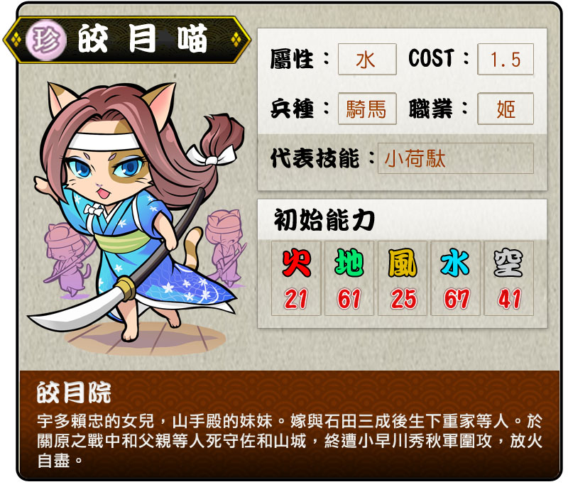 「皎月喵」為山手殿的妹妹,石田三成正室,關原之戰與父親宇多賴忠及三成家族一起死守佐和山城,卻因小早川秀秋反叛,寡不敵眾而自盡!遊戲中擁有「小荷馱」技能可恢復遠處我方隊伍1名貓武將的兵力!