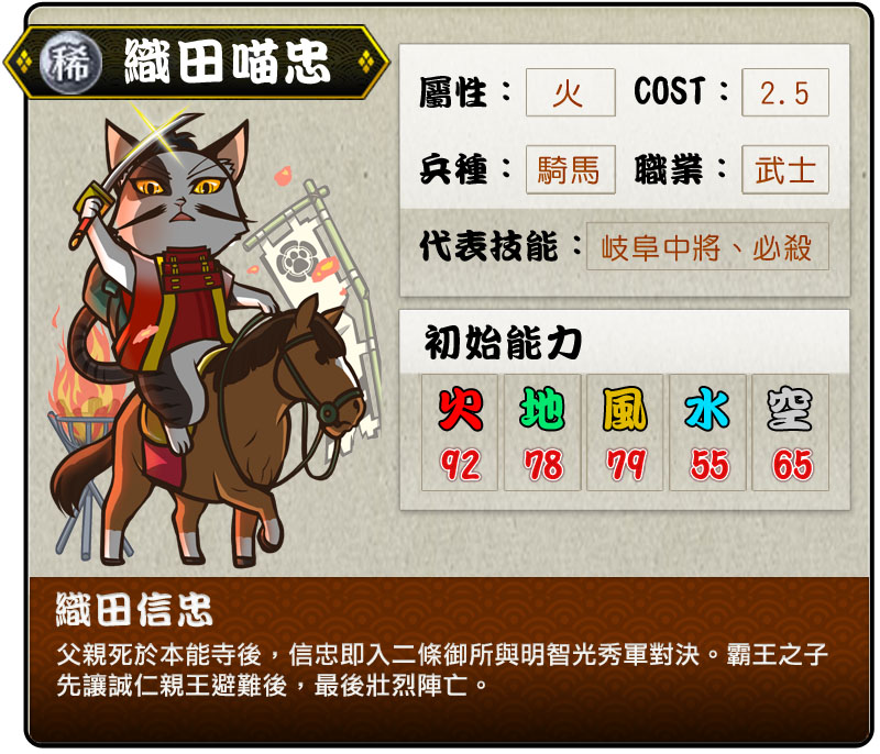 火屬性的「織田喵忠」為織田信長的長子,本名勘九郎信重,後改為信忠,一生跟隨信長征戰各地,後以總大將身份攻打美濃岩村城立下戰功,「本能寺之變」中,因保護皇太子誠仁親王逃跑而遭明智光秀重軍包圍,信忠自盡,享年二十六歲!遊戲中其獨特技能「岐阜中將」,可攻擊1隻敵貓,降低其可弱化我方屬性的技能發生率。