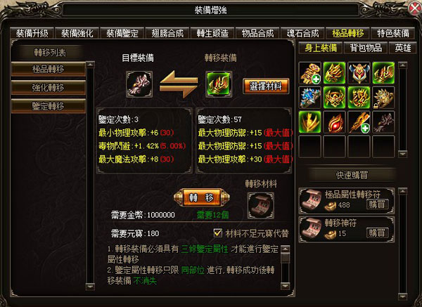 即日起,玩家將可體驗遊戲新增的裝備強化、鑒定轉移功能「移花接木」,只要消耗少量的金幣或元寶,玩家即可將舊裝備中強化、鑒定屬性瞬間轉移至所需裝備上。如此貼心的新功能相信讓戰神更加心無旁騖的追求逆天神器。