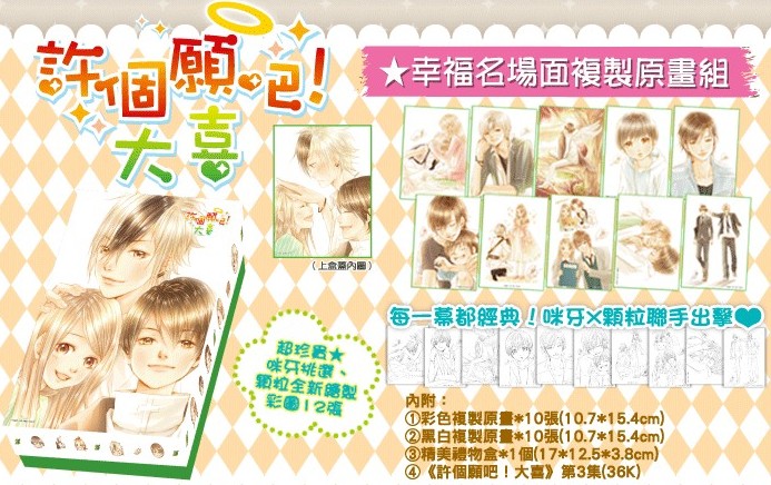 簽名資格版&一般版精品皆含─ 幸福名場面複製原畫組 彩色和黑白各十張 10.7×15.4cm 精美禮物盒×1個17×12.5×3.8cm 《許個願吧!大喜(03)》單行本 |