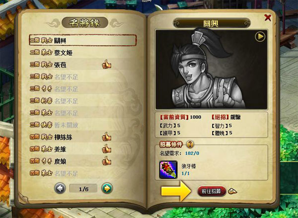 在洛陽找到關興後,系統將自動開啟「名將錄」,這時玩家便可招募首位小弟關興。打開名將錄,玩家可看到標示清楚的名將,包含「已招募」、「可招募」、「無法招募」等狀態,而無法招募的武將旁將標示著原因。