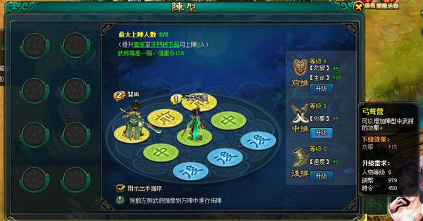 在贈送狼牙棒成功招募到首位武將後便可開啟「陣型」進行調兵遣將。進入陣型介面,即可拖動人物進入方陣中,並進行陣型的搭配。