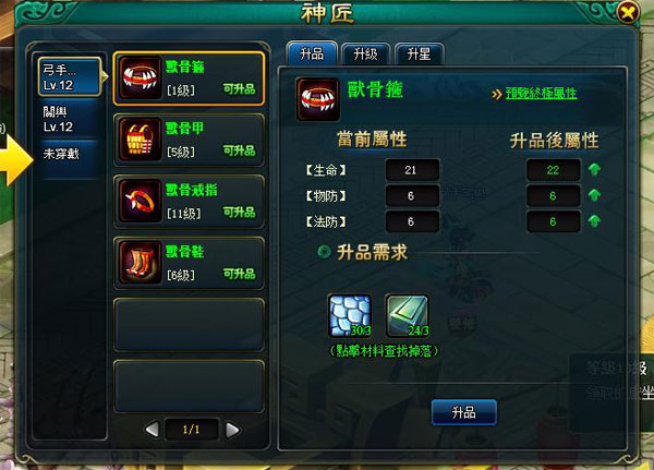 只要一路跟隨著劇情前進,即可直升至 12 級,同時將開放新玩法「神匠系統」,透過此功能可對主角以及武將穿戴的裝備屬性進行提升。對裝備進行升品不需要消耗任何銅錢,而是要收集介面上顯示的相對數量的原材料,而玩家也可以點擊的材料圖示查看材料掉落信息,前往刷怪收集材料。