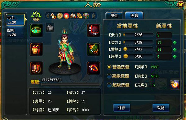 達到 13 級時,遊戲將自懂開啟「洗髓玩法」,點選人物介面後即可進入洗髓標籤頁。玩家只要耗費一定的銅幣便可以對角色或者武將進行普通洗髓操作,要注意的是,洗髓後要記得點選「保存」才會發會效果。