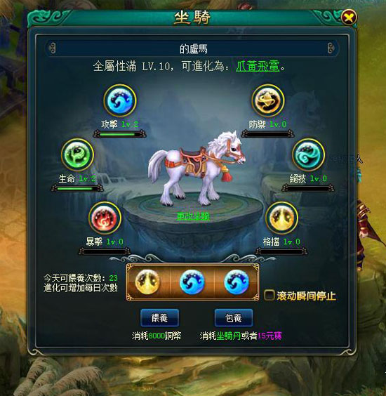 《桃園英雄傳》中的坐騎不僅可以提升角色移動速度外,還可以增加角色全屬性。進入坐騎介面對坐騎進行餵養,將隨機提升騎寵六大屬性。當全屬性都滿足 LV10 時,的盧馬便可進化為更高階騎寵爪黃飛電。