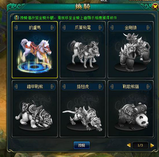 此外,點選更換坐騎還可以查看其他高階騎寵形態以及獲得騎寵的相對條件。若想要更換騎寵坐騎外觀,角色坐騎屬性加成依舊決定於所擁有的最高階騎寵。