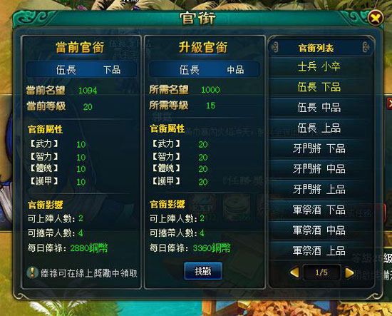 官銜等級將影響可上陣人數、角色可攜帶人數以及每日可領取的線上俸祿。因此想要快快升官,除了等級之外,還必須努力提升角色的威望哦。