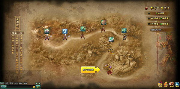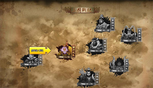 與「官銜系統」同步開放的是《桃園英雄傳》的推圖副本「三國戰記」,玩家可進入世界地圖,逐個擊敗地圖中的敵人方可通關所選經典戰役副本。怪物被首次擊敗後頭上便會標誌與之戰鬥可獲得的材料,方便玩家採集裝備升品資源。