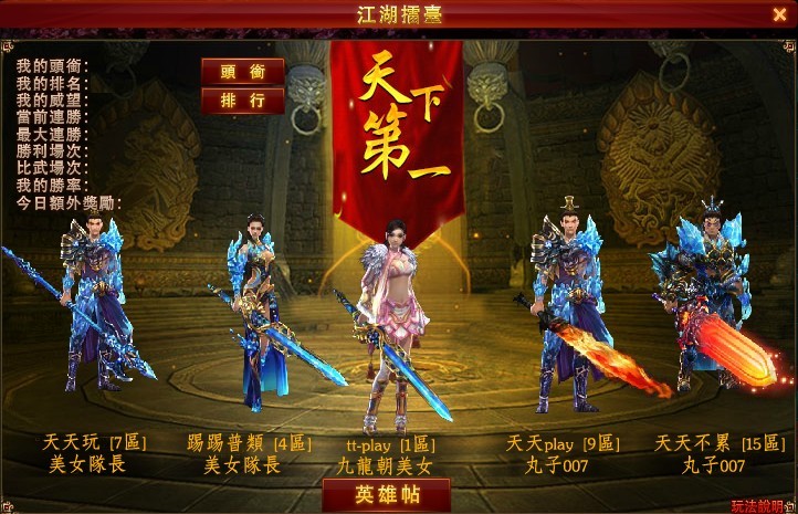 九龍朝》「江湖擂台」系統中按下【英雄帖】後,系統將為匹配與玩家旗鼓相當的對手,雙方將使出渾身解數在武林大會展開一場驚天動地的王者對決!