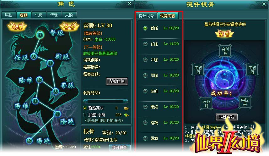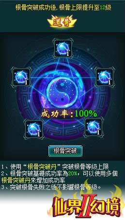 在仙界的世界裡,提升根骨絕對是迅速提升戰鬥力的重要途徑之一,當單純的經脈提升、根骨提升已經無法滿足大家需求時,根骨突破絕對是必要且有效的手段,保證明顯幫助仙友們戰鬥力火爆上升,對各位的爭霸之路可說是一大助力,更加通暢無阻。