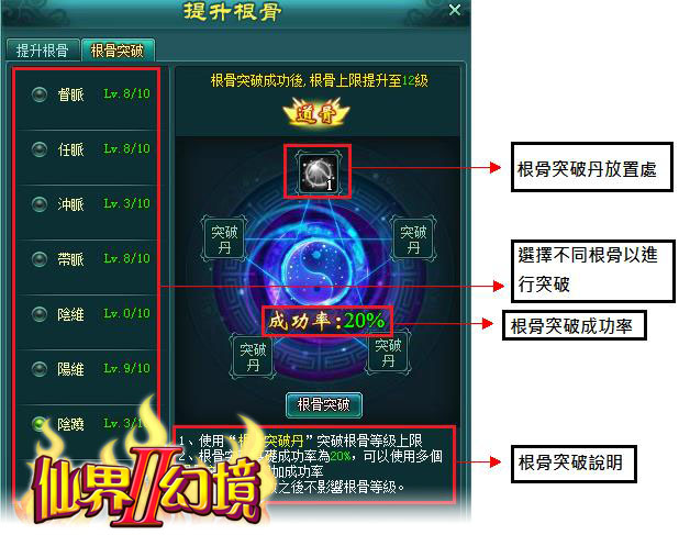 而根骨本身提升上限為 10 級,只要通過根骨突破後,上限將逐漸遞增。可由 10 級上限透過不斷的提升增加至 20 級上限。
