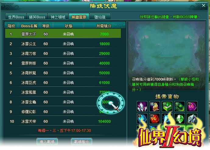 兩個新戰場的開放時間有所不同,「無盡雪原」於每周一、三、五 17:00~17:30 開放進去;而另一戰場「墮仙嶺」則為每周二、四、六 17:00~17:30 開放讓玩家進去,兩個地圖交錯開放,讓玩家玩起來也更多變化有趣!
