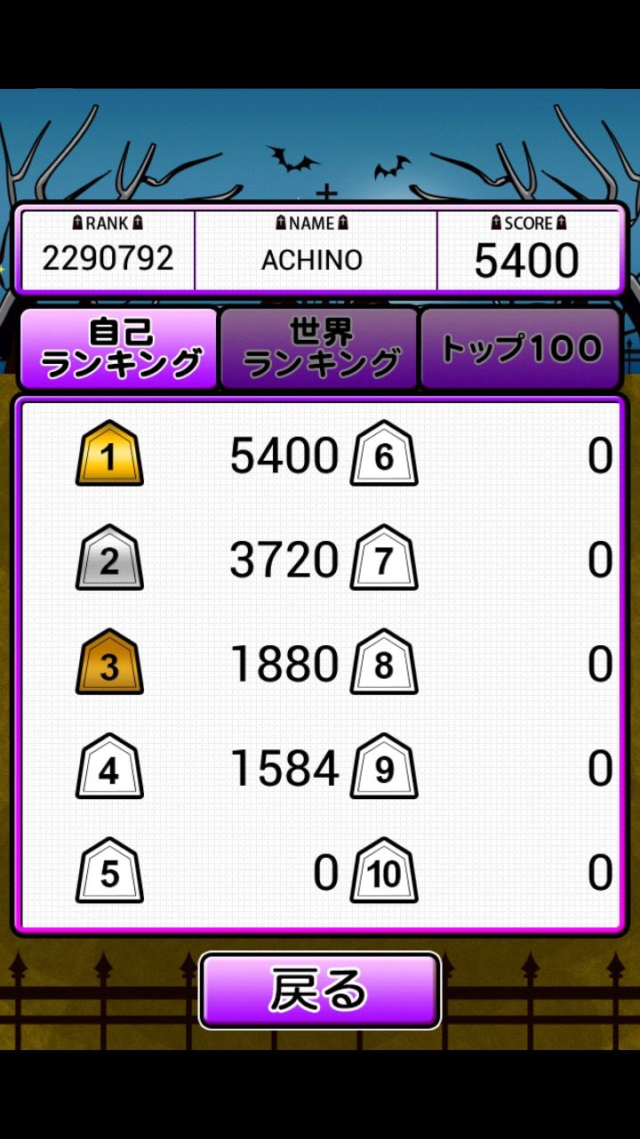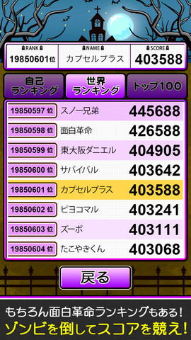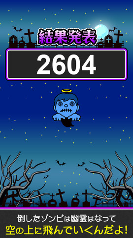 在 30 秒後,一回合就算結束,這時遊戲會自動統計玩家總共宰了多少隻,進行評分並宣布玩家的排名,畫面上會告訴玩家目前的分數是玩家自己排行榜上的第幾名,還有和更上面的名次差了多少分。如果玩家想要知道這樣的分數可以在世界上眾多的殭屍獵人中排在哪裡,可以點選回到標題畫面後,再進入世界排行中觀看-你將會發現,這世界上果然是人外有人,天外有天。