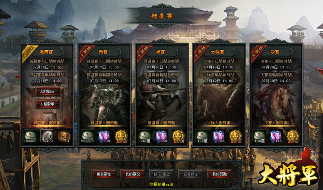 大將軍》即將開啟全新 1V1 擂台賽,擂台之上沒有人情,只有實力的比拼。據悉,本次跨服擂台賽要經過報名、海選賽、預選賽、複賽、半決賽、決賽、領獎七個環節。玩家進入八強,即可獲得豐厚的獎勵,更設置有季軍、亞軍、冠軍的特別獎勵。沒有進入八強的玩家也無需氣餒,因為除此還設置有參與獎、新秀獎、精英獎等多達 32 強獎勵哦!