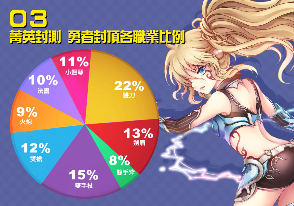 這是菁英封測期間,所有封頂勇者各職業的比例圖,帥氣的雙刀受到最多人的喜愛,足足有 22% 呢!