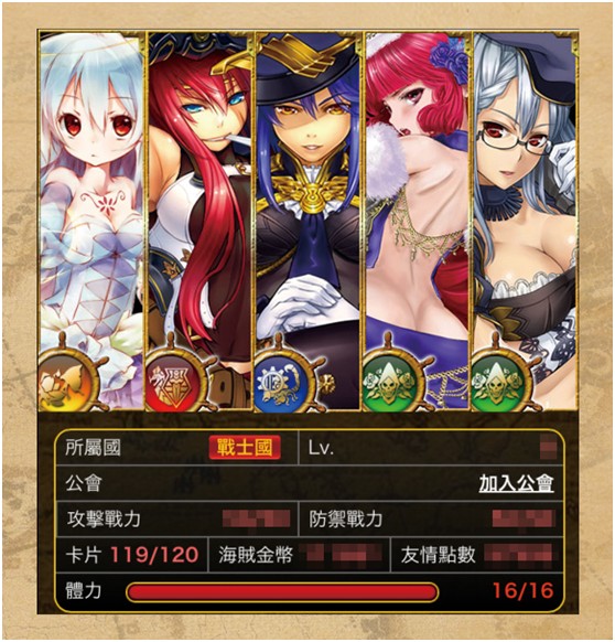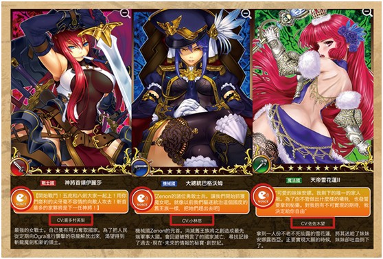 五大陣營以不同顏色劃分:當中,紅色=戰士國,藍色=機械國,綠色=魔法國,白色=聯合國,雜色=妖獸族;戰士、機械、魔法三國均盛產對應職業的正妹卡牌,但出於設計平衡考慮,每個國度也會有少量的另類職業存在;例如戰士國裏也會見到為數稀少,罕有的魔女和槍械師喔。至於聯合國和妖獸族的更多特點,有待玩家親自探索。