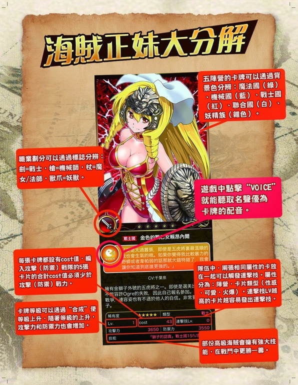 海賊幻想遊戲中近95%的卡牌以及部分主線劇情與副故事,都有日本動漫名聲優的傾情獻聲,同一個聲優的聲線,鮮明演繹出截然不同的人物性格!演員優秀精湛的配音技術,在圖鑒中輕點【VOICE】,就可聽到!