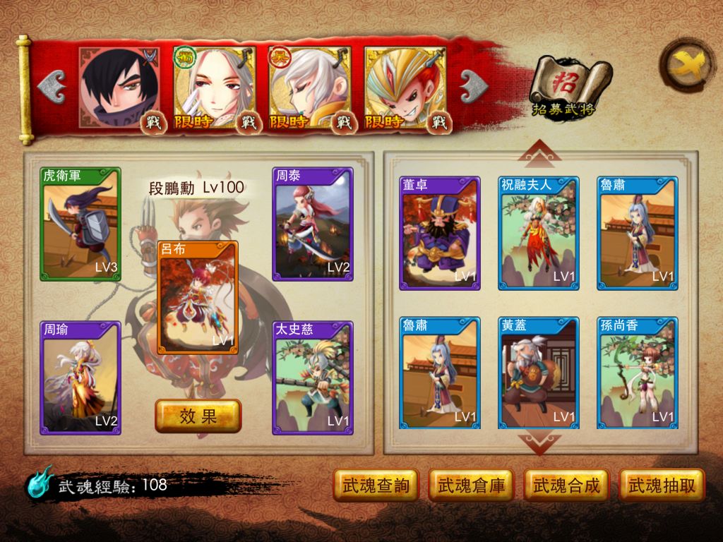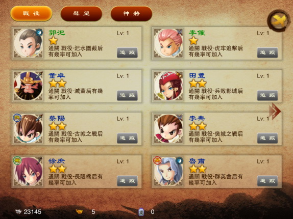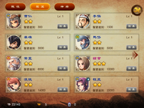 都督戰記》最特別的特色之一,就是這些「五星級神將」的招募難度較低,只要滿足等級條件即可進行招募。不過要注意的一點是,招募這些神將必需花費元寶,玩家可得量力而為唷!