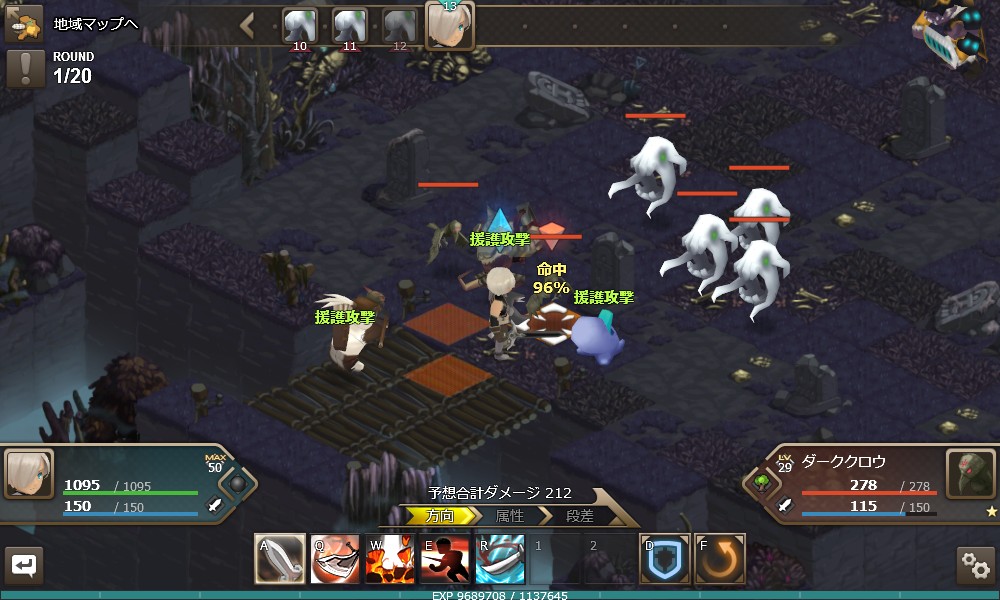 另外角色單位滿足特定條件時就會進行援護攻擊。每個職業的條件都不同,戰士的場合是主角攻擊的時候,攻擊可能的我方角色單位就會對同一個敵人進行追加攻擊。遊俠的場合是我方角色單位進行攻擊的時候,主角會對同一個敵人進行追加攻擊,巫師的場合是主角受到敵方攻擊時,在附近的我方角色單位就會對該敵人進行反擊。