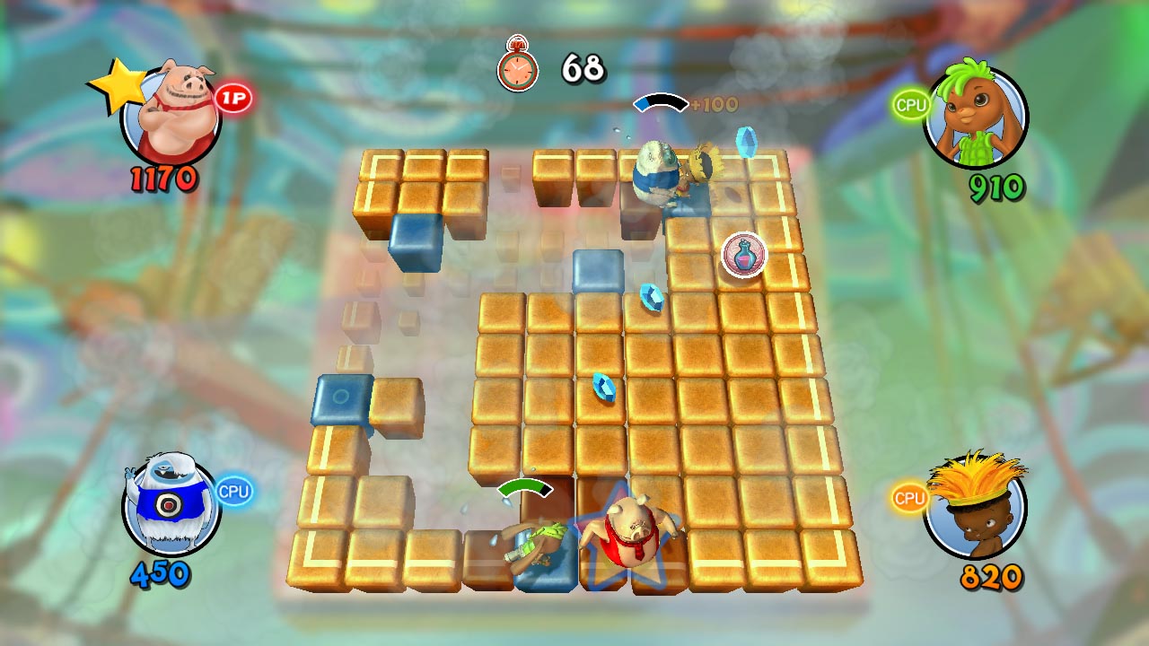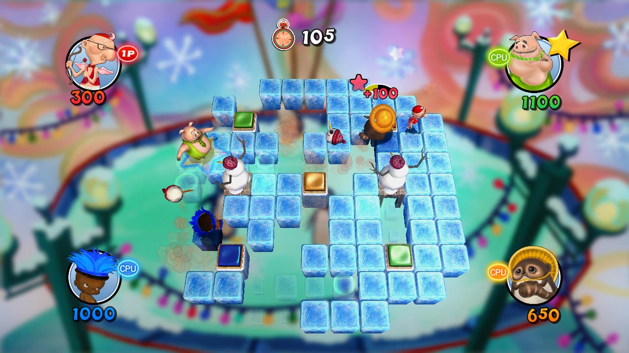 當踩上按鈕時就代表搶奪了一個據點,同時也會獲得一個分數。當場再搶奪一個據點時,將會獲得更高的分數。但別忘了,這個比賽的場地在冰上,滑滑的地板將讓你移動困難,同時還會出現雪人拿雪球丟你,記得拿取場上的防護罩道具,它不僅可以防止被攻擊,還可以讓你正常的行走。分數最高的就是本次的勝利者。