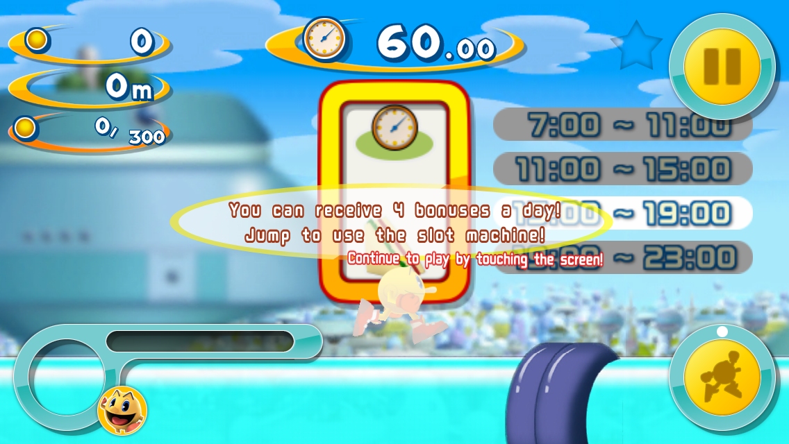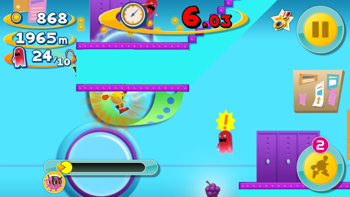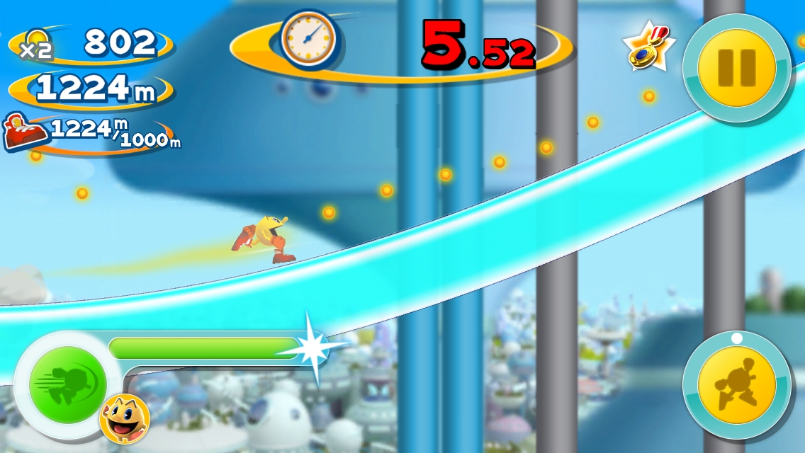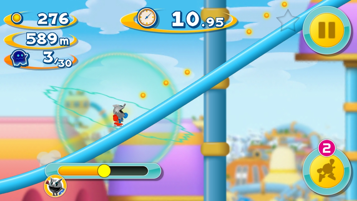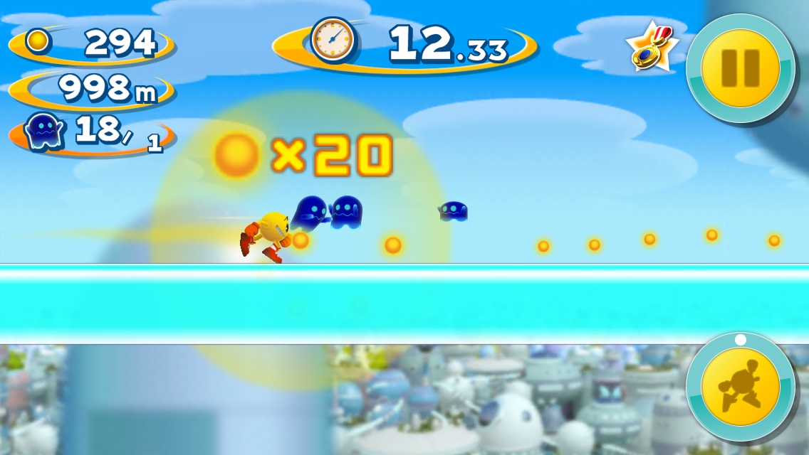 在遊戲裡 Pac-Man 會不停地奔跑,玩家能操作的部分只有跳躍或是使用身上裝備的輔助效果,過程中吃到餅乾會逐漸加速,吃愈多速度感愈明顯,而經由衝撞獵取的幽靈數愈多,玩家的過關時限秒數也會增加,提高任務完成機率!