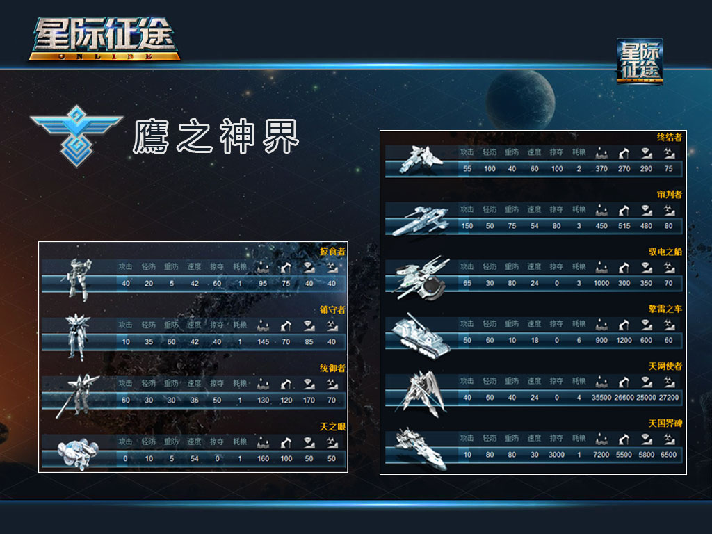 鷹之神界的輕裝兵力構成中突出了初期攻擊性兵種優勢。等資源豐富的條件下,可以用統禦者替換掠食者成為攻擊力的主體。鎮守者對輕裝防禦效果欠佳,所以需要快速升級出重裝兵營通過終結者來加強。與人類聯邦對戰,建議以掠食者的數量為主,多依靠攻擊來獲得戰場主動的態勢,如發現對方有重裝兵種,相應招募一些鎮守者輔助統禦者防禦即可。面對旭日帝國,建議連續不斷的招募掠食者發動攻擊,消耗對方防禦兵力,直到耗完為止。