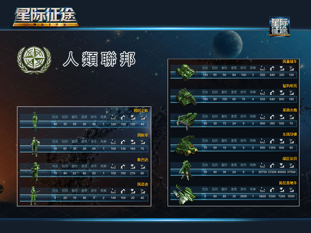 人類聯邦的兵種輕重皆宜,可以根據不同對手去制定生產任務。面對旭日帝國以輕重結合為主,對鷹之神界以輕為主重為輔。人類兵種總體感覺是輕裝兵種攻守皆宜,重裝兵種以攻代守。兵種成本是三個文明中最高的,所以戰略上以發展資源等級,繼續力量為主。