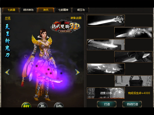 神兵完成七階段的打造後進入鑄造階段,需要神鑄錘,完成後就可以擁有該神兵,鑄造也會給予大量屬性加成,每把神兵都有超拉風的外形和更霸氣神兵外形,背上妳的神兵利器,閃耀江湖吧!!