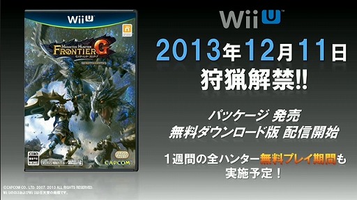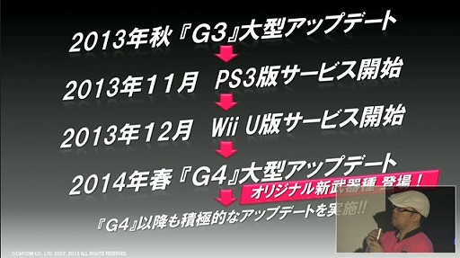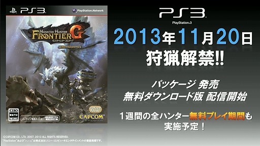 魔物獵人 Frontier G》,預定 2013 年秋季進行「G3」大型改版,2013 年 11 月 PS3 版、12 月 Wii U 版開始營運,2014 年春季進行「G4」大型改版,之後會積極實施改版更新。PS3 版與 Wii U 版將採用個別伺服器營運,基本月費(30 日)1400 日圓,兩版本都會推出內含虛寶裝備的套裝版,下載版則是免費提供。預定營運前 1 個月進行封測。