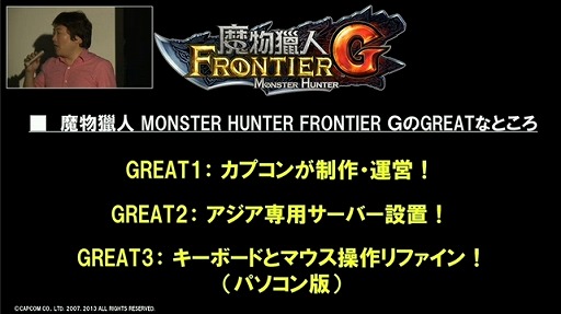 魔物獵人 Frontier G》,由 CAPCOM 自行製作營運,將設置亞洲專用伺服器,PC 版會針對鍵盤滑鼠操作進行修改。