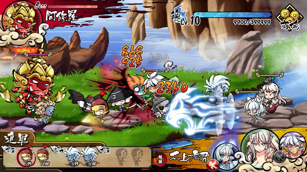 戰鬥操作方式容易上手,戰鬥時玩家只要根據右上角的「魂」數量,不斷點擊左下的進軍駐列派遣小兵,或是選擇派遣右下方的仙人大將進行攻擊。不過,當玩家派出自己的仙人大將後就無法施放技能囉。此外,玩家還可利用滑鼠左右移動,調整畫面,以觀察戰況。