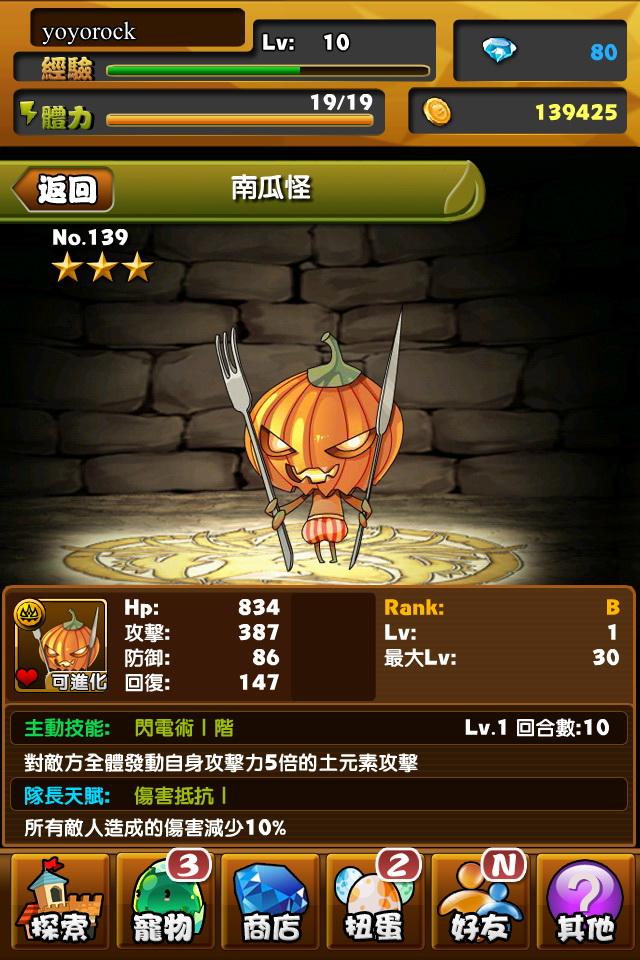 3☆南瓜怪隊長天賦為「所有敵人造成的傷害減少10%」,而且可進化為4☆南瓜小新,喜愛利用減傷技能的玩家,不要錯過這次的收割機會!